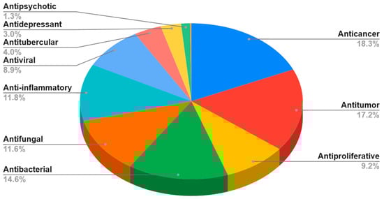 Bibliometric analysis: percentage distribution of articles across various biological activities of benzo[b]furan derivatives from 2011 to 2022 (data obtained from the Scopus database using the keywords: “benzo[b]furan” and each one activity).