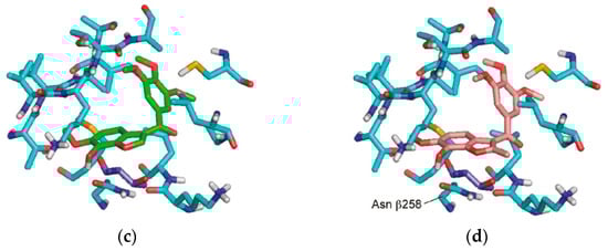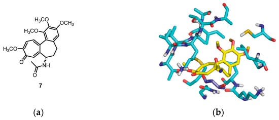 The molecular docking study utilized the X-ray crystal structure of the bovine α,β-tubulin dimer complexed with podophyllotoxin (PDB ID code: 1SA1). The benzo[b]furans were docked at the colchicine site using Glide. (a) The structure of colchicine 7; (b) comparison with the orientation of colchicine 7 bound to the crystal; and (c,d) the docked orientations of 4b and 6a, respectively. The β-subunit of tubulin is represented by carbon atoms in light blue, and the Thr residue R179 is depicted in dark blue. Reprinted (adapted) with permission from ref. []. Copyright American Chemical Society, 2023.