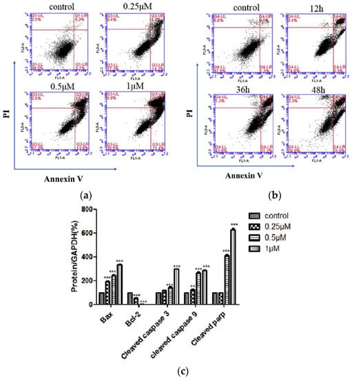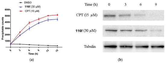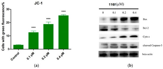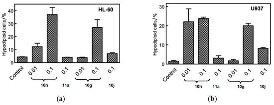 Compounds 10g, 10h, 10j, and 11a were put on approval against (a) HL-60 and (b) U937 cells for 24 h at indicated concentrations (in µM). Apoptosis was determined using flow cytometry. Values represent the mean ± SE of three independent experiments, each conducted in triplicate. Reproduced with permission from ref. []. Copyright John Wiley & Sons Inc., 2023.
