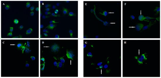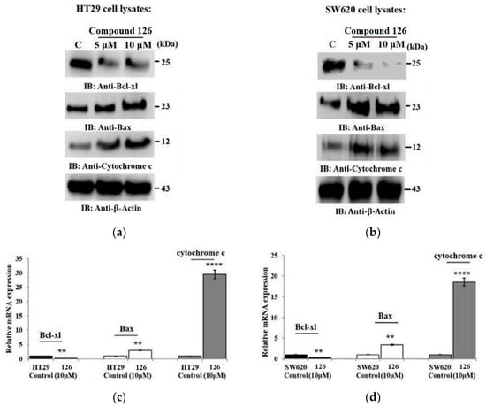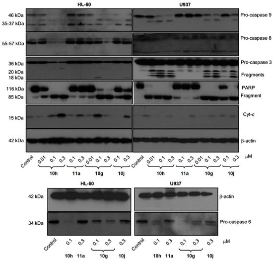 To further examine the apoptotic effects of compounds 10g, 10h, 10j, and 11a, proteolytic processing of caspases in HL-60 and U937 cells was observed by Western blot analysis (Figure 5). Compounds 10g, 10h, 10j, and 11a allowed the cleavage of inactive procaspase-9 to the active 37 kDa fragment, while lower concentrations of compounds 10g and 10h (0.3 µM) significantly promoted procaspase-8 hydrolysis. Furthermore, compounds 10g and 10h significantly led to the cleavage of inactive procaspases-3 and -6 in both cell lines (Figure 5). Additionally, the induction of poly(ADP-ribose)polymerase (PARP) cleavage showed that compounds 10j and 11a exhibited lower potency in inducing PARP cleavage compared to compounds 10g and 10h. The appearance of the fragment at 85 kDa coincided with caspase-3 activation, observed by a decrease in the proenzyme at 36 kDa and an increase in cleaved procaspase-3 levels at 20 and 18 kDa (Figure 5). Dose–response studies were performed, and cytosolic preparations were analyzed by immunoblotting to investigate whether apoptosis induced by compounds 10g, 10h, 10j, and 11a in HL-60 and U937 cells involved the release of cytochrome c from mitochondria into the cytosol during the apoptotic event. The results revealed a significant increase in the amount of cytochrome c in the cytosol of both cell lines at 15 kDa (Figure 5).