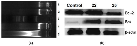 DNA fragmentation analysis was conducted by incubating A549 cells with a 50 nM concentration of compounds 22 and 25. The results revealed a discrete staircase pattern after 48 h of treatment, indicative of significant fragmentation associated with cell death (Figure 7a). Additionally, Western blot analysis was realized on the same cancer cell line, treating it with the same concentration of compounds 22 and 25 as used in the DNA fragmentation analysis (Figure 7b). After 48 h of treatment, it was observed that the anti-apoptotic protein Bcl-2 was down-regulated, while the pro-apoptotic protein Bax was up-regulated. The results provide evidence that the induction of apoptosis by compounds 22 and 25 is associated with Bcl-2 down-regulation.