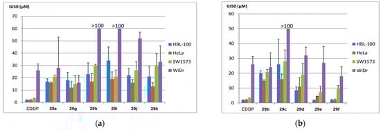 Antiproliferative activity (GI50, µM) in various human solid tumor cell lines, including HBL-100 (breast), HeLa (cervix), SW1573 (non-small-cell lung), and WiDr (colorectal). The compounds evaluated are presented in two groups: (a) 29a, 29g–k, and (b) 29b–f. Reproduced with permission from ref. []. Copyright John Wiley & Sons Inc., 2023.