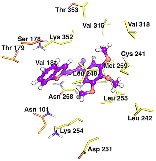Binding modes between 32a and α/β tubulin in complex with colchicine-DAMA (PDB ID code: 1SA0). The inhibitors are represented as purple ball-and-stick models, while the tubulin residues are shown as orange (α-tubulin) and yellow (β-tubulin) sticks. Reproduced with permission from ref. []. Copyright Elsevier Inc., 2023.