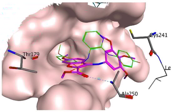 Binding modes of compound 35g (represented in magenta) in the colchicine site of tubulin (PDB ID code: 3HKC). The co-crystallized ligand N-[2-[(4-hydroxyphenyl)amino]-3-pyridinyl]-4-methoxybenzenesulfonamide (PDB ID code: ABT751) is represented in green. Reprinted (adapted) with permission from ref. []. Copyright American Chemical Society, 2023.