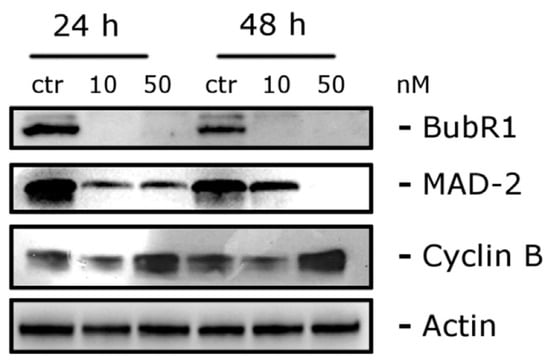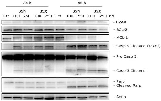 Conducting Western blot studies, we aimed to explore the potential of compounds 35h and 35g in triggering apoptosis via the activation of caspase-3 and caspase-9, crucial components of the mitochondrial apoptotic pathway. Upon exposing HeLa cells to these compounds, we observed a concentration- and time-dependent activation of caspases, as depicted in Figure 11. Moreover, both in vitro and in vivo revealed the activation of poly(ADP-ribose) polymerase (PARP), a major substrate targeted by caspase-3. In addition to these findings, we carefully examined the role of Bcl-2 and Mcl-1 proteins, well known for their capacity to counteract pro-apoptotic proteins and preserve mitochondrial membrane potential. After 48 h of treatment with concentrations of 100 and 250 nM for both compounds, a decrease in Bcl-2 protein expression was observed, while Mcl-1 showed strong down-regulation. Interestingly, at 24 h, Mcl-1 expression increased for 35g but not for 35h. These results suggest that compounds 35g and 35h effectively down-regulate anti-apoptotic proteins.