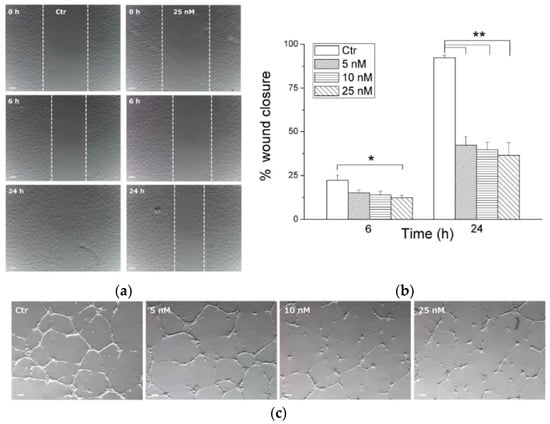 To assess angiogenesis, the vascular properties of 35g (the most potent within the series) were investigated in vitro using HUVEC endothelial cells. The endothelial cell motility and the ability of 35g to disrupt tubular structures formed by HUVECs on Matrigel were investigated. As shown in Figure 12a,b, at a concentration of 25 nM, compound 35g exhibited significant inhibition of cell motility within just 6 h of incubation. This inhibitory effect remained highly significant at all concentrations after 24 h of incubation. Moreover, in Figure 12c, it was observed that compound 35g disrupted the network of HUVECs compared to the control after 1 h of incubation. Remarkably, after 3 h, all tested concentrations demonstrated significant disruption of the tubular-like structures.