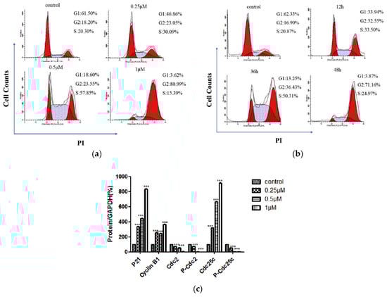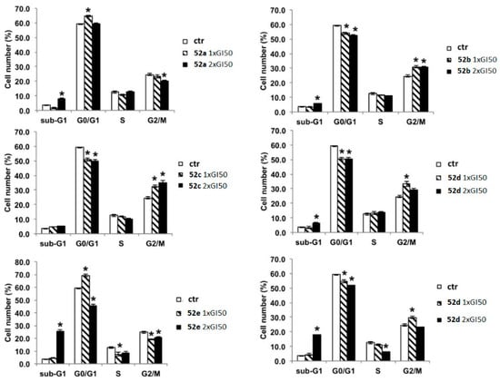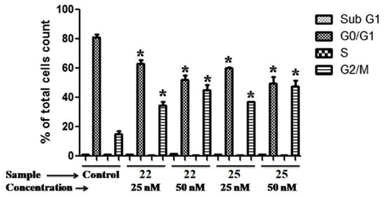 Cell cycle evaluation of compounds 22 and 25 in the MCF-7 cell line. The data are presented as the percentage of cell count at each induced cell cycle phase for each compound (* p < 0.05 vs. control). Reproduced with permission from ref. []. Copyright Elsevier Inc., 2023.