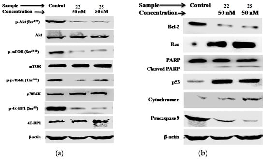 Analysis of the PI3K/Akt/mTOR pathway and apoptotic markers in MCF-7 cells treated with compounds 22 and 25 for 48 h at a concentration of 50 nM. The expression levels of (a) Akt, mTOR, p70S6K, and 4E-BP1, including their phosphorylated forms, as well as (b) cytochrome c, Bax, Bcl-2, p53, procaspase-9, and PARP, were measured. Protein expression levels were analyzed using Western blot analysis, with β-actin serving as the loading control in both cases. Reproduced with permission from ref. []. Copyright Elsevier Inc., 2023.