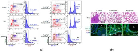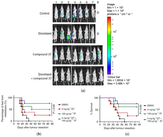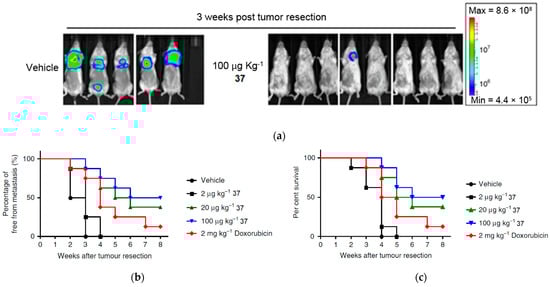 The investigation into the antimetastatic effects of compound 37 involved the injection of luciferase-expressing 4T1-Luc2 transgenic mouse cells into the mammary fat pad of the experimental mice []. At 15 days after tumor cell implantation, the 4T1 tumors were surgically resected in situ. Over the following 8 weeks, a comparative analysis of tumor metastatic activity and survival was conducted between the control group and the mice treated with compound 37 (Figure 15a–c). By detection of luminescent activity of 4T1-Luc2 cells as an indicator of tumor metastasis, it was observed that treatment with 37 (≥20 µg kg−1) significantly suppressed 4T1 cell metastasis to the lung (Figure 15a). In addition, treatment with 37 at a relatively low dose (>20 µg kg−1) had considerable antimetastatic activity in comparison with the treatment with Doxorubicin (2 mg kg−1) (Figure 15b), used as a control drug for breast cancer. Treatment with 37 also significantly increased the survival rate of mice with tumor resection (Figure 15c). These results demonstrate that the in vivo administration of compound 37 effectively prevents breast tumor metastasis following tumor resection.