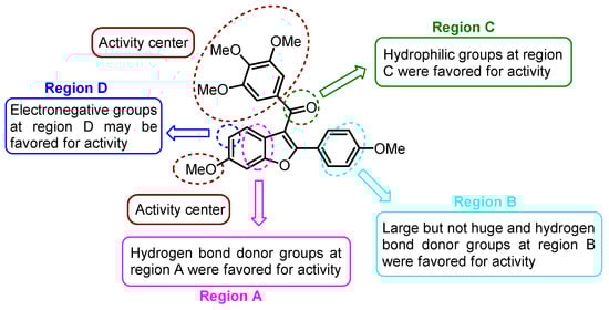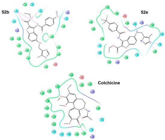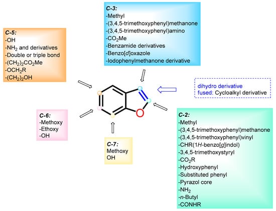 Interactions within the α- and β-tubulin structure have surfaced as a remarkable topic for exploring novel chemotherapeutic agents. Among the key domains, the colchicine binding site has emerged as a pivotal target for potential inducers of destabilization in tubulin polymerization. Colchicine binding site inhibitors (CBSIs) exert their biological impact by impeding tubulin assembly and limiting microtubule formation. In this context, benzo[b]furans have taken center stage, being designed and synthesized into a wide range of molecules interacting with the colchicine binding site, imparting marked structural diversity. Many compounds in this review demonstrated anticancer properties due to their inhibition of tubulin polymerization, achieved primarily through binding to the colchicine binding site on tubulin [,,,,,,,,] (Figure 55). This is mainly achieved by the incorporation of the characteristic recognition fragment analogous to colchicine at positions C–2 or C–3 of benzo[b]furan, (3,4,5-trimethoxyphenyl)methanone [,,,,], and their corresponding analogs [,,], which interact through hydrogen bonds between methoxy groups and Cys241 as well as van der Waals interactions between phenyl ring and aromatic residues at the colchicine binding site on tubulin []. On the other hand, the methyl group located at positions C–2 or C–3 occupies hydrophobic pockets, while the necessity of hydrogen bonding interactions of methoxy or hydroxyl groups at positions C–6 and C–7 with the tubulin structure is evident. In particular, the hydrogen bonding interaction of the methoxy group at C–6 with Asnβ258 has remarkable significance [,]. This interaction not only enhances the antiproliferative activity in breast, renal, and melanoma cancer cell lines [,] but also contributes to the suppression of breast cancer metastasis []. Furthermore, additional hydrogen bonding interactions with donating groups like amino, hydroxyl, and unsaturations at C–5, along with alkyl ester derivatives [] and alkoxy derivatives [], play a role in stabilizing the active site of α- and β-tubulin [], leading to the inhibition of different cancer cell lines []. Regarding substitution at position C–2, the diversity of functional groups allows the formation of hydrogen bonding interactions at active sites, and they also encompass aromatic groups that possess the ability to engage in π–π stacking with aromatic residues [,,,,,,,]. Notably, modifications such as the loss of aromaticity in the furan ring and the fusion of aliphatic chains on the d-side of benzo[b]furan enable the maintenance of activity against diverse cancer cell lines.