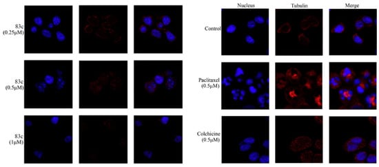 Compounds 35e and 35g–j, along with CA-4, were investigated to determine their inhibitory effects on tubulin polymerization and colchicine binding to tubulin. The aim was to gain insights into their mechanisms of antiproliferative action, particularly their interaction with tubulin microtubules (Table 9). The results revealed that compound 35g exhibited the highest potency among the tested compounds, with an IC50 of 1.1 µM, comparable to that of CA-4. Meanwhile, compound 35h demonstrated slightly lower activity compared to CA-4. Compounds 35e, 35i, and 35j showed 6–7 times lower potency than CA-4, with IC50 values of 7.5, 7.6, and 6.4 µM, respectively. Regarding colchicine binding studies, outcomes were observed exclusively for compounds 35g and 35h, exhibiting inhibition percentages of 83% and 74%, respectively, which are comparable to the 99% inhibition observed with CA-A. The findings underscore the intricate interplay between the inhibition of tubulin polymerization and the hindrance of colchicine binding, shedding light on their potential synergistic effects in influencing antiproliferative pathways.