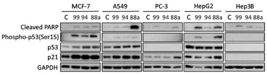 Western blot analysis was conducted on HeLa cells treated with different concentrations of compounds 35g or 35h to investigate their effects on H2AX, Bcl-2, Mcl-1, caspase-3, cleaved caspase-9, and PARP. β-Actin was used as the loading control. Reprinted (adapted) with permission from ref. []. Copyright American Chemical Society, 2023.