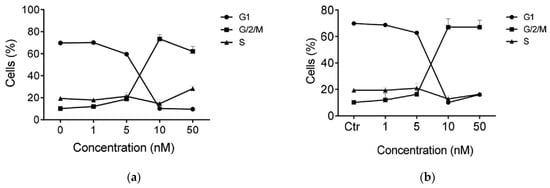Expanding on the encouraging results regarding the antiproliferative and anticancer activity [], Kamal et al. conducted more extensive investigations on benzo[b]furans 22 and 25 to explore their potential efficacy against breast cancer cell lines, specifically MCF-7 and MDA MB-231. These studies involved assessments of the cell cycle and the PI3K/Akt/mTOR signaling pathway, along with other complementary studies []. Table 10 presents the results obtained for the antiproliferative activity of compounds 22 and 25 against the mentioned cancer cell lines. Remarkably, 22 and 25 displayed significant activity, especially in the MCF-7 cell line, exhibiting IC50 values of 0.057 and 0.051 µM, respectively. Due to the MCF-7 cell line showing the highest anticancer activity among the tested cell lines, it was chosen for further analysis to investigate the correlation between cell growth inhibition and cell cycle arrest. In this study, MCF-7 cells were treated with the compounds 22 and 25 at concentrations of 25 nM and 50 nM for 48 h. The results revealed that these compounds induced G2/M cell cycle arrest compared to the untreated control cells. Specifically, at a concentration of 25 nM, compounds 22 and 25 caused a cell accumulation of 36.4% and 37.1%, respectively, in the G2/M phase. Moreover, at 50 nM, these percentages increased to 47.6% and 50.5%, respectively, in the same cell phase (Figure 13).