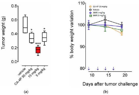 CA-4 and its analogs have been clinically termed vascular disruptors agents (VDAs) [], so glycine prodrug 13 was tested to see its ability as a VDA in an in vivo model in rat breast cancer tumors, using the spatial frequency optical technique (SDFI). With 10 min of administration of compound 13 (30 mg kg−1), there is a rapid decrease in oxygen saturation in tumor tissues similar to that observed with CA-4, confirming that prodrug 13 causes vascular disruption in vivo.