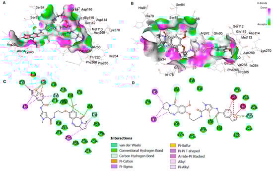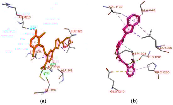 In a separate study, Penthala et al. synthesized a series of heterocyclic analogs, including indoles, benzofurans, and benzothiophenes, based on Combretastatin, and assessed their anticancer activity against a panel of 60 human cancer cell lines []. The benzo[b]furans were synthesized by condensing benzo[b]furanocarbaldehyde 30 (1.0 mol) with phenylacetonitrile 31 (1.1 mol) in a 5% sodium methoxide/methanol solution for 3–6 h, resulting in the successful formation of the desired product 32 (Table 7). The evaluation of anticancer studies focused on compounds 32a, 32b, and 32d against 60 cancer cell lines. Compound 32a exhibited the most favorable results, displaying GI50 values ranging from <0.01 to 73.4 µM across all 60 cell lines. It effectively inhibited the growth of 70% of the evaluated cancer cell lines, with a remarkable GI50 value < 0.01 µM in almost all cases. On the other hand, substituting the 3,4,5-trimethoxyphenyl group in 32a (R = 2-CHO, R1 = OMe, R2 = OMe) with the 3,4-dimethoxyphenyl group in 32b (R = 2-CHO, R1 = H, R2 = OMe) resulted in reduced growth inhibition against 54% of the cancer cells, exhibiting GI50 values ranging from 0.229 to 0.996 µM. Furthermore, compound 32b exhibited potent anti-proliferative activity in MDA-MB-435 melanoma cells, exhibiting a remarkable GI50 value of 0.229 µM. Similarly, compound 32d (R = 3-CHO, R1 = OMe, R2 = OMe) displayed significant antiproliferative inhibition, with GI50 values ranging from 0.237 to 19.1 µM, and effectively inhibited 52% of the evaluated cell lines with a GI50 value < 1 µM. In addition, the evaluation of anti-leukemia activity against the MV4–11 cell line was performed for compounds 32a–d (Table 7), demonstrating that 32a emerged as the most active compound among the evaluated benzo[b]furans in the leukemia cell line. Later, a molecular docking simulation was performed to investigate the interactions of compound 32a with α/β tubulin in complex with colchicine-DAMA (PDB ID code: 1SA0). The simulation revealed a hydrophobic interaction at the α–β interface, where colchicine binds, and stability was observed through van der Waals interactions with Asn101, Ser178, Thr179, and Val181 in α-tubulin, as well as Asn258 and Lys352 in β-tubulin (Figure 9). The calculated free energy value for these interactions was −7.74 kcal/mol.