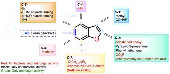 Surprisingly, an exploration of the Scopus database covering the years from 2011 to 2022, encompassing all fields with the keywords “benzo[b]furan” and “biological activity,” has revealed a total of 7482 documents. Among these, 5431 are categorized as articles, while 1451 are identified as reviews. Notably, the array of published articles showcases a diverse spectrum of keywords, spanning a wide range of activities, including anticancer, antitumor, antiproliferative, antibacterial, antifungal, anti-inflammatory, antiviral, antitubercular, antidepressant, antipsychotic, α7 nAChR agonist, and antiosteoporosis activities (Figure 2). The data related to the last two activities are somewhat limited and may not be readily distinguishable on a graphic. Within this broad spectrum of activities, it is important to emphasize that articles related to cancer (anticancer, antitumor, and antiproliferative), as well as those focused on antimicrobial activity (antibacterial and antifungal), collectively constitute approximately 70% of the observed activities (Figure 2).
