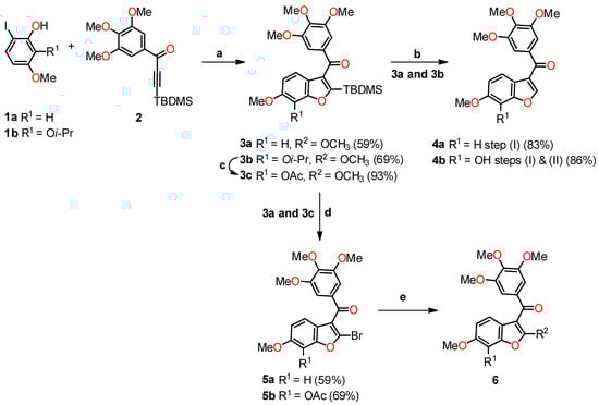 Benzo[b]furan derivatives have demonstrated a fascinating array of biological and pharmaceutical activities, including antitumor properties. For instance, Flynn et al. described the discovery of 7-hydroxy-6-methoxy-2-methyl-3-(3,4,5-trimethoxybenzoyl)benzo[b]furan (BNC105, 6a, R1 = OH, R2 = Me), a potent and selective antiproliferative agent. They achieved the synthesis of various derivatives, many of which were obtained through a modified Larock-type coupling between o-iodophenol 1a,b and 3-silyl-1-arylpropinone 2, yielding 2-silylbenzo[b]furans 3a,b in 59% and 69% yields, respectively (Scheme 1) [,]. Subsequently, silanes 3a (R1 = H) and 3b (R1 = Oi-Pr) underwent treatment with TBAF in methanol to remove the silyl groups. For compound 3b, an additional reaction with AlCl3 was performed to eliminate the isopropyl group, resulting in the formation of compounds 4a (R1 = H) and 4b (R1 = OAc) with yields of 83% and 86%, respectively. On the other hand, compound 3a underwent bromodesilylation with a 59% yield, producing 2-bromobenzo[b]furan 5a (R1 = H). To avoid competitive bromination of the C–4 position of benzo[b]furan during the bromodesilylation process of 3b, the isopropyl group was first exchanged for an acetyl group, yielding compound 3c. Subsequent bromodesilylation of 3c resulted in the formation of compound 5b with a 69% yield. Additionally, the brominated derivatives 5a and 5b exhibited versatile functionality allowing bromine replacement through palladium coupling or nucleophilic displacement, leading to the formation of analog series 6, which includes heterocyclic, carbocyclic, and alicyclic analogs at C–2 of benzo[b]furan (Table 1). One striking example of the versatility of the brominated derivatives is observed in the synthesis of the biologically significant compound 6a (R1 = OH, R2 = Me), which was obtained via a Negishi reaction, coupling the derivative 5b with methylzinc bromide using palladium, achieving an impressive 93% yield.