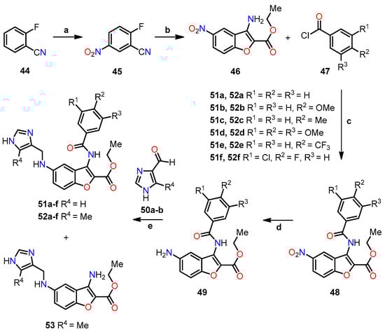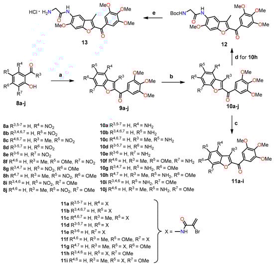 Synthesis of benzo[b]furans 9–13. Reagents and conditions: (a) 2-bromo-1-(3′,4′,5′-trimethoxyphenyl)ethanone, K2CO3, acetone, reflux, 18 h; (b) Fe, HCl (37% in H2O), EtOH, reflux, 3 h, 42–79%; (c) α-bromoacrylic acid, EDCI, BtOH, DMF, r.t, 18 h, 44–66%; (d) N-Boc-glycine, EDCI, BtOH, DMF, r.t, 12 h, 83%; (e) 3M HCl in EtOAc, r.t, 3 h, 95%. Yields for compounds 9a–j have not been reported by the authors.