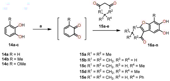 Interestingly, Wellington et al. conducted the synthesis of a variety of dihydroxylated 5,6-benzo[b]furans 16 with catechol derivative 14 using a commercial laccase, Suberase®, under different reaction conditions []. All the synthesized compounds were evaluated for their anticancer properties. The synthetic protocol consisted of reacting an equivalent of catechol 14 with an equivalent of the 1,3-dicarbonyl compound 15 at room temperature using Suberase® in an air-open vessel at pH 7.15 (Scheme 3). In method A, the reaction of catechol derivatives 14a–c with 1,3-dicarbonyls compounds 15a–e was performed at room temperature at pH 7.15 for 24 h. In method B, the reaction was conducted under similar conditions with an extended time of 44 h to investigate the potential enhancement in product yield with prolonged reaction time. In method C, a mixture of the 1,3-dicarbonyl compound and catechol, combined in a 4:1 ratio, was dissolved in DMF. Subsequently, the resulting mixture was left to react for 42 h. The results obtained from methods A–C are shown in Table 4. In particular, method A demonstrated the most favorable outcome of the three methods, exhibiting the highest yield of 98% for compound 16j (Entry 15, Table 4). On the other hand, method B afforded compound 16k in a 77% yield (Entry 18, Table 4), while method C yielded 71% for compound 16g (Entry 11, Table 4). It is worth noting that the reaction time in Method B had minimal impact on the yield, whereas the presence of DMF in method C may have potentially deactivated the laccase, Suberase®, leading to lower yields.