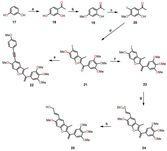 In 2013, Kamal et al. synthesized a series of benzo[b]furans with a modification at position 5 of the benzene ring by introducing C-linked substituents to generate 2-(3′,4′,5′-trimethoxybenzoyl)benzo[b]furan derivatives []. The most biologically interesting benzo[b]furan derivatives, 22 and 25, were synthesized through a sequence of reactions depicted in Scheme 4, which included (a) the acylation of 17 to yield product 18; (b) methylation using methyl iodide and potassium carbonate, resulting in 19; (c) iodination with iodine and silver nitrate in a catalytic amount to produce 20; (d) cyclization with 2-bromo-1-(3,4,5-trimethoxyphenyl)ethanone and potassium carbonate in acetone to furnish the benzofuran derivative 21; (e) Sonogashira coupling reaction to obtain 22; (f) Wittig reaction with the ylide generated from methyltriphenylphosphonium bromide in the presence of LiHMDS, leading to 23; (g) Heck coupling reaction with ethyl acrylate to yield the ethyl cinnamate derivative 24; and (h) ester reduction with DIBAL resulting in the formation of (E)-allyl alcohol 25.