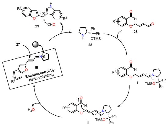 The enantioselectivity of compound 29 is explained through the proposed reaction mechanism depicted in Scheme 5. It begins with the condensation reaction between aldehyde 26 and organocatalyst 28 to form iminium ion I. Then, the isomerization of I gives dienamine intermediate II, which undergoes intramolecular condensation/dehydration sequence to afford iminium ion III. At this pivotal stage, indole 27 undergoes an attack on intermediate III, leading to the formation of product 29 with remarkable enantioselectivity. This precise enantiocontrol is facilitated by the steric shielding offered by the bulkier group (CPhPhOTMS) present in the organocatalyst.