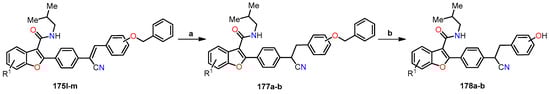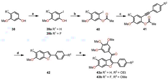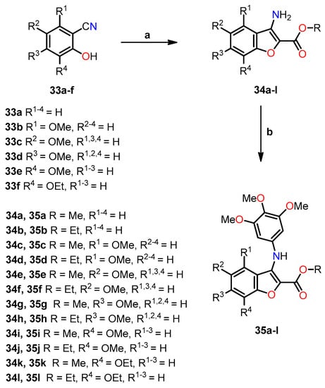 Synthesis of benzo[b]furan analogs 35a–l and the reactions conditions: (a) BrCH2CO2CH3 or BrCH2CO2C2H5, K2CO3, DMF, 60 °C for 4 h, then reflux for 8 h, 52–78%; (b) 1-bromo-3,4,5-trimethoxybenzene, Pd(OAc)2, BINAP, Cs2CO3, PhMe, 100 °C, 16 h, 52–78%. Reprinted (adapted) with permission from ref. []. Copyright American Chemical Society, 2023.