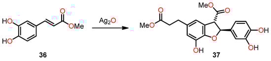 In their study, Yin et al. achieved the successful synthesis of 2,3-dihydrobenzo[b]furan 37 in a 32% yield through the dimerization of methyl caffeate 36 using silver oxide in the presence of anhydrous benzene and acetone (Scheme 7). The primary aim of this study was to explore the potential correlation between IL-25, an endogenous factor secreted by tumor-associated fibroblasts (TAFs), and the inhibition of metastasis in 4T1 mammary tumors in mice [].