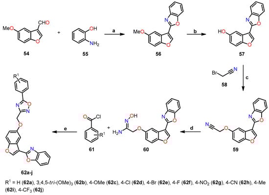 - Irfan, A.; Faiz, S.; Rasul, A.; Zafar, R.; Zahoor, A.F.; Kotwica-Mojzych, K.; Mojzych, M. Exploring the synergistic anticancer potential of benzofuran–oxadiazoles and triazoles: Improved ultrasound- and microwave-assisted synthesis, molecular docking, hemolytic, thrombolytic and anticancer evaluation of furan-based molecules. Molecules 2022, 27, 1023. [Google Scholar] [CrossRef] [PubMed]
