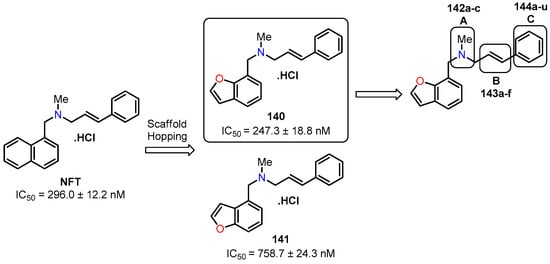 In the same year, Wang et al. undertook the synthesis of a series of analogs derived from naftifine hydrochloride (NFT), specifically designed to target the CrtN enzyme for the treatment of MRSA infections []. Among this array, compound 144l emerged as the most promising analog (Table 39). Recognizing NFT’s established antifungal properties, a comparative analysis was conducted, gauging whether compound 144l exhibited analogous effects. The outcomes, as presented in Table 48, unveiled that the compound 144l analog displayed modest antifungal activity across all tested fungal strains, including Trichophyton rubrum, with MIC values reaching 16 µg/mL (128 times less potent than NFT). This variance in efficacy might be attributed to the structural difference between the benzofuran core of 144l and the naphthalene moiety of NFT.