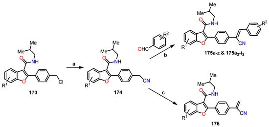 Synthesis of (Z)-benzo[b]furan-2-yl and (Z)-benzo[b]furan-3-yl cyanocombretastatins 32a–f and the evaluation of their anti-leukemic activity (LD50) against the MV4–11 AML cell line.