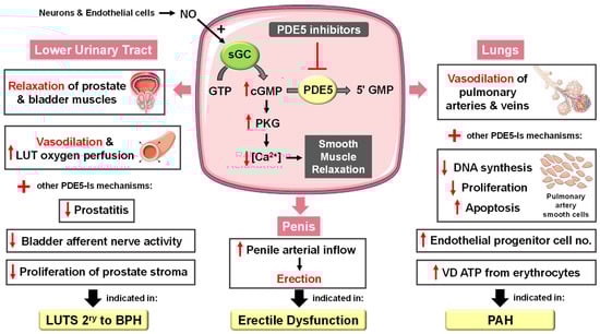 Approved clinical uses of PDE5 inhibitors. Nitric oxide (NO) is produced by neurons and endothelial cells. Inside smooth muscle cells, NO activates soluble guanylyl cyclase (sGC), promoting the conversion of guanosine triphosphate (GTP) to the second messenger cyclic guanosine monophosphate (cGMP). Thereafter, cGMP activates protein kinase G (PKG), whose phosphorylation mediates activities of various membrane channels/pumps, leading to decreased intracellular calcium levels resulting in smooth muscle relaxation (SMR). Phosphodiesterase 5 (PDE5) regulates cGMP levels by degrading it into inactive 5′ guanosine monophosphate (5′ GMP). PDE5-Is can thus enhance the cGMP/PKG pathway, boosting the relaxation of various smooth muscles. In the penis corpus cavernosum, SMR favors erection due to increased penile arterial inflow, and thus PDE5-Is are approved for the treatment of erectile dysfunction. In the lungs, PDE5-Is lead to vasodilation of pulmonary vasculature, which, along with other mechanisms, such as suppressed DNA synthesis and proliferation and enhanced apoptosis of pulmonary artery cells, increased endothelial progenitor cell number, and enhanced release of vasodilating adenosine triphosphate (ATP) from erythrocytes culminate in effectiveness in the treatment of pulmonary arterial hypertension (PAH). In the lower urinary tract (LUT), PDE5-Is mediate prostate and bladder SMR, vasodilation and increased LUT oxygen perfusion. In addition, PDE5-Is could suppress prostatitis, bladder afferent nerve activity and prostate stroma cell proliferation, and thus indicated in the treatment of LUT symptoms secondary to benign prostatic hyperplasia (BPH).