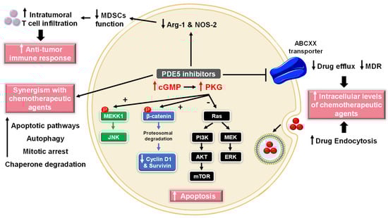 Several studies provided evidence that PDE5-Is can increase cellular concentrations of standard chemotherapeutic drugs or even enhance their efficacy within certain tumor cells where a combination of potential agents allows the reduction of dose levels and, consequently, of toxic side effects (Figure 3) [76,85,86,87].