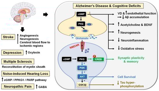 cGMP/PKG signaling has been regarded as a central mechanism of neuroinflammation, neurodegeneration and cognitive disorders [106,107]. Accordingly, PDE5-Is have gained growing attention as potential therapeutic agents for the treatment of several CNS-related diseases, such as Alzheimer’s disease (AD), cognitive deficits, strokes, multiple sclerosis (MS), depression, noise-induced hearing loss (NIHL) and neuropathic pain that will all be discussed in this section (Figure 4).
