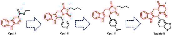 - Daugan, A.; Grondin, P.; Ruault, C.; Le Monnier de Gouville, A.-C.; Coste, H.; Kirilovsky, J.; Hyafil, F.; Labaudinière, R. The discovery of Tadalafil: A novel and highly selective PDE5 inhibitor. 1: 5, 6, 11, 11a-Tetrahydro-1 H-imidazo [1′, 5′: 1, 6] pyrido [3, 4-b] indole-1, 3 (2 H)-dione analogues. J. Med. Chem. 2003, 46, 4525–4532. [Google Scholar] [CrossRef]