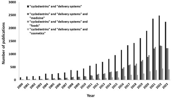 Trends in the number of publications that contain the words “cyclodextrins” and “delivery systems”; “cyclodextrins” and “delivery systems” and “medicine”; “cyclodextrins” and “delivery systems” and “food”; and “cyclodextrins” and “delivery systems” and “cosmetics” in the title, abstract or keyword fields, in the period 2000–2023 (Science Direct search carried out on 28 August 2023).