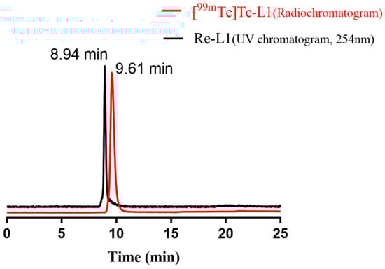 Co-injection analysis of [99mTc]Tc-L1 (radiochromatogram) and Re-L1 (UV chromatogram, 254 nm).