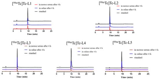 The Log D values of the five tracers are shown in Table 1, and the data indicate that [99mTc]Tc-L1 is hydrophilic, while the lipophilicities of [99mTc]Tc-L2, [99mTc]Tc-L3, [99mTc]Tc-L4 and [99mTc]Tc-L5 are close. Compared with [99mTc]Tc-L2, which contains a carbon chain (n = 7), [99mTc]Tc-L1 containing a polyethylene glycol (PEG, n = 4) chain has a lower Log D value, indicating that [99mTc]Tc-L1 is more hydrophilic and the addition of PEG chains can effectively improve the hydrophilicity. By comparing [99mTc]Tc-L3, [99mTc]Tc-L4 and [99mTc]Tc-L5, it was found that the lipophilicities of the three 99mTc-complexes with phenyl ring were close, indicating that there was no positive correlation between the increase in the number of carbon atoms on both sides of the phenyl ring in these substituents and the lipophilicity of these 99mTc-complexes.
