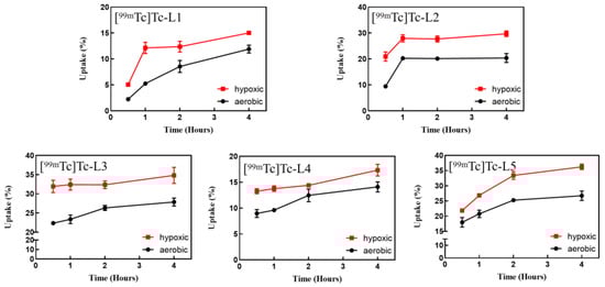 The in vitro cellular uptake of five tracers was tested on S180 cells under both aerobic and hypoxic conditions. Figure 4 shows that the uptake of the five complexes under hypoxic conditions was significantly higher than the uptake under aerobic conditions (p < 0.05, in Table S1), which indicates that they had good hypoxia selectivity.