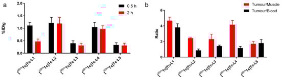 Tumour uptake at 0.5 h and 2 h post-injection (a) and tumour-to-blood and tumour-to-muscle ratios at 2 h post-injection (b) of 99mTc-complexes (n = 5).