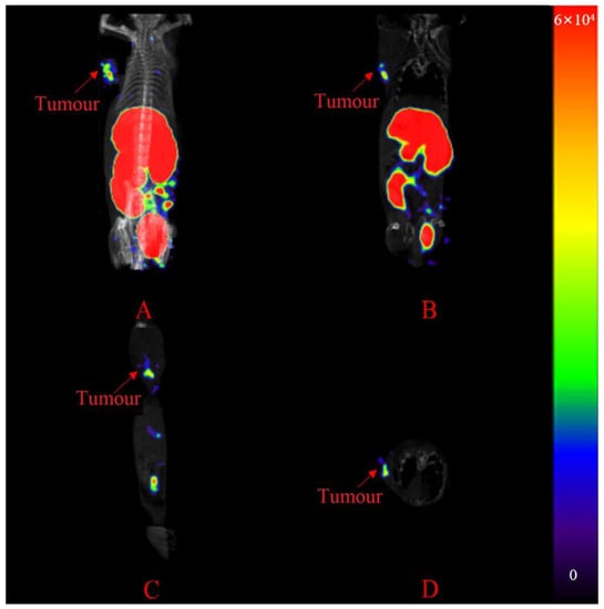 SPECT/CT images of [99mTc]Tc-L1 at 2 h post-injection. Maximum intensity projection (A), sagittal section (B), coronal section (C) and transverse section (D).