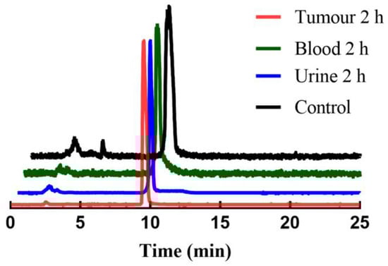 [99mTc]Tc-L1 (0.2 mL, 111 MBq) was injected into Kunming mice bearing S180 tumours via a tail vein. After 2 h, the mice were sacrificed, then urine, blood and tumour were collected. The urine was passed through a 0.22 µm microporous membrane and analysed by HPLC. The blood was centrifuged at 10,000× g for 3 min, then 100 μL of the supernatant was mixed with 200 μL of acetonitrile. After centrifugation, the protein was precipitated and removed, and the supernatant was collected and passed through a 0.22 µm microporous membrane, then it was concentrated and analysed by HPLC. The tumours were homogenised by a TH-02 tissue-tearor (Omini, Kennesaw, GA, USA) with 200 μL saline, then 400 μL of acetonitrile was added into the centrifuge tube and the mixture was centrifuged to precipitate the protein, and the supernatant was collected after centrifugation. Then, the supernatant was passed through a 0.22 µm microporous membrane, concentrated by rotary evaporator and analysed by HPLC. The method of HPLC was the same as the method in Section 4.3.