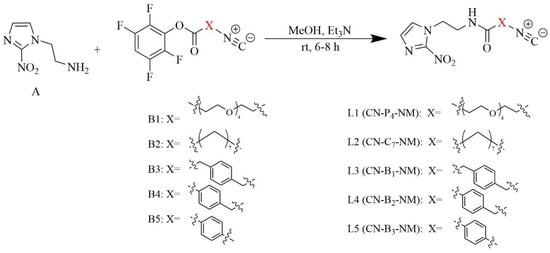 The synthesis of the amino derivative of 2-nitroimidazole (Compound A) and isocyanide-containing active esters (Compounds B1–B5) is shown in the Supplementary Data, and the routes to generate ligands (L1–L5) are shown in Scheme 1. The 2-nitroimidazole amino derivative (Compound A, 0.078 g, 0.5 mmol) and isocyanide-containing active esters (Compounds B1–B5, 0.6 mmol) were dissolved in 3 mL of methanol, and 0.2 mL of triethylamine was added. Then, the mixtures were stirred for 6–8 h at r.t. Afterwards, the solvent was evaporated under reduced pressure, and the residue was purified by column chromatography (CH2Cl2/CH3OH = 5:1) to obtain Ligands L1–L5.