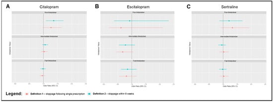 Forest plots that highlight odds ratios and 95% confidence intervals for regression models evaluating associations between CYP2C19 metaboliser status and SSRI discontinuation defined in two ways, with normal metabolisers as the reference group. Definition 1 (red) entails abrupt stoppage of prescriptions following a single prescription, while definition 2 (blue) entails abrupt stoppage following a prescription window lasting less than 8 weeks. Models were adjusted for age at first prescription, sex, genotype batch, and binary overlap with an antipsychotic prescription. Associations are shown for discontinuation of (A) citalopram, (B) escitalopram, and (C) sertraline.