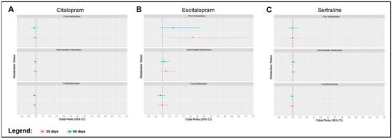 Forest plots that highlight odds ratios and 95% confidence intervals for regression models evaluating associations between CYP2C19 metaboliser status and SSRI switching within 30 days (red), 60 days (green), and 90 days (blue), with normal metabolisers as the reference group. Models were adjusted for age at first prescription, sex, genotype batch, and binary overlap with an antipsychotic prescription. Associations are shown for switching from (A) citalopram, (B) escitalopram, and (C) sertraline to another antidepressant.