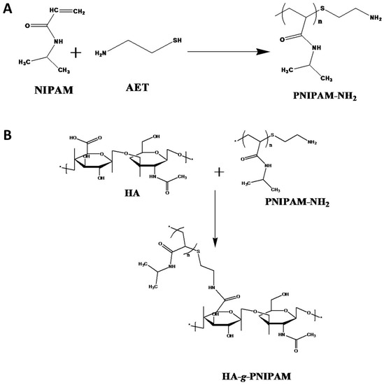 The synthesis of amine-terminated poly(N-isopropylacrylamide) (PNIPAM-NH2) using 2-aminoethanethiol (AET) as a chain transfer agent during free radical polymerization of N-isopropylacrylamide (NIPAM) (A), and the conjugation of PNIPAM-NH2 to HA to synthesize hyaluronic acid-g-poly(N-isopropylacrylamide (HPN) (B).
