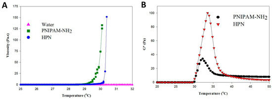 The viscosity (A) and complex shear modulus (B) of 5% (w/v) PNIPAM-NH2 or HPN solution as a function of temperature.