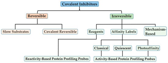 In general, covalent inhibitors can be broadly classified into two categories based on whether the inhibition is reversible or irreversible upon dialysis, competition with excess substrate, or extended incubation times. While different covalent inhibitors may exhibit the same reversibility or irreversibility of inhibition, each employs distinct strategies to selectively form and break bonds with the targeted enzyme. Identifying and categorizing these strategies helps to illuminate the inherent advantages and disadvantages associated with each mechanism [,,,,,].