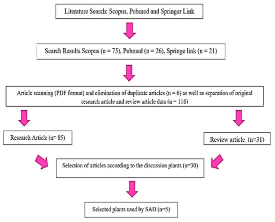 The review was conducted in May 2023 and involved several steps. Firstly, a literature search was performed using Scopus, PubMed, and Springer Link, with specific eligibility criteria and keywords. The collected articles were then converted into PDF format and duplicate articles were eliminated. After that, they were categorized into research articles and review articles. Next, relevant articles were selected based on the topic of interest. Finally, the chosen articles were included in the review. The flow diagram is shown in Figure 1.