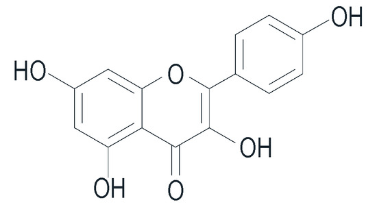In addition to curcumin, K. rotunda also contains various chemical compounds. Previous studies have identified terpenoids, such as kaempulchraol and kaemgalangol, along with abietane, labdane, and clerodane types in this plant. It also contains phenolic compounds (diarylheptanoids, curcuminoids, and methoxylation derivatives of cinnamic acid), flavonoids (kaempferol and kaempferide), steroids and triterpenes (β-sitosterol), and essential oils (including ethyl trans-p-methoxycinnamate, ethyl cinnamate, cineole, camphene, borneol, pentadecane, and α-pinene) [101,102,103]. The characterization of the rutin of novel secondary metabolites with medicinal properties confirms the intra-specific variation among different Kaempferia species [104,105,106], highlighting unexplored curative potentials that require further detailed explanations. Kaempferol, which is present in K. rotunda, exhibits antioxidant activity that synergistically contributes to its anti-aging effects [106,107]. Figure 7 shows the chemical structure of kaempferol.