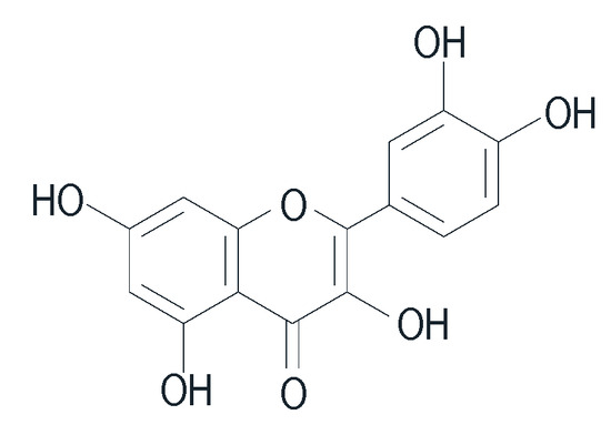 Figure 8 shows the chemical structure of quercetin. Quercetin-3-O-α-L-rhamnopyranoside, isolated from C. longa, demonstrates antioxidant activity in scavenging 1,1-diphenyl-2-picrylhydrazyl (DPPH) radicals and exhibits strong activity similar to vitamin C. Therefore, C. longa has the potential to be developed for its anti-aging effects or prevention of premature aging. The antioxidant activity works synergistically to stabilize Reactive Oxygen Species (ROS) during the process of photoaging [103,107]. Many SAD people use C. longa as a body scrub and mask for skin care.